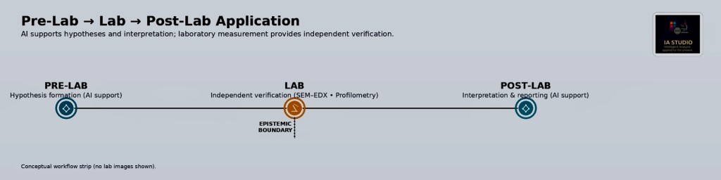 In this framework, AI-assisted tools are used only for supervised exploratory work (structured visual review, anomaly mapping, and hypothesis drafting before lab access; and interpretation support after measurement). Empirical validation comes exclusively from independently produced laboratory datasets (e.g., SEM–EDX; optical profilometry).