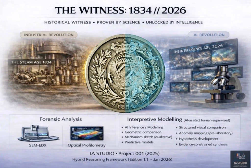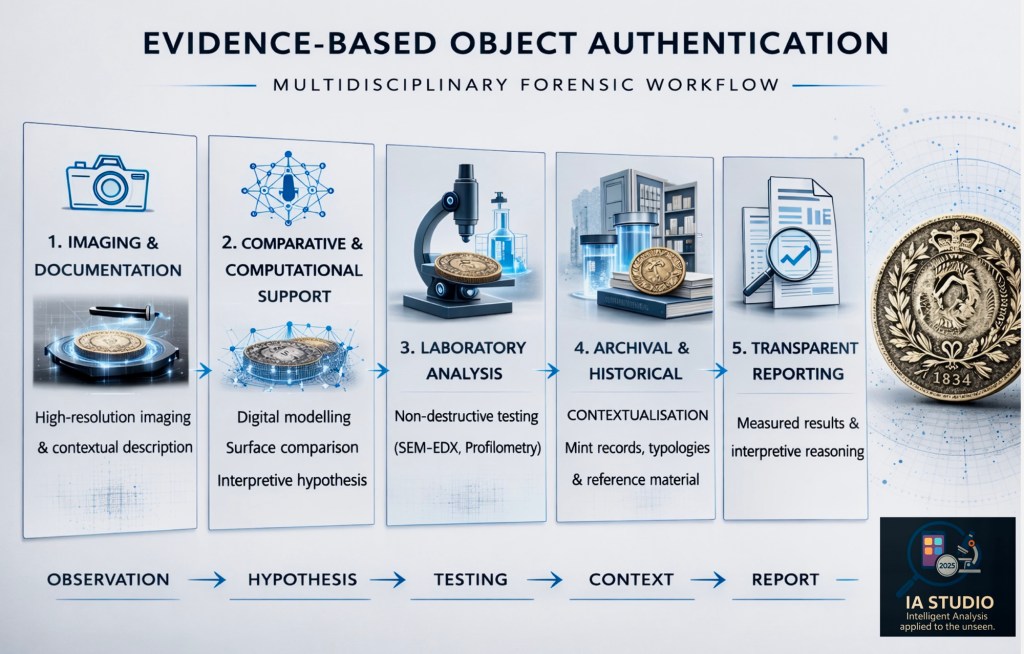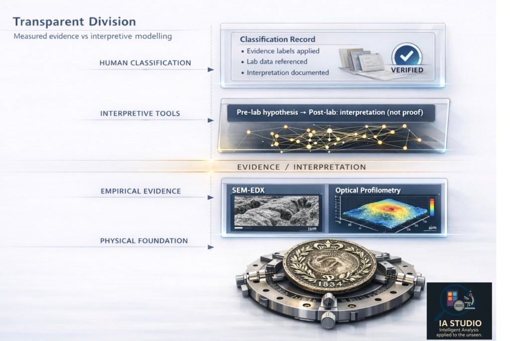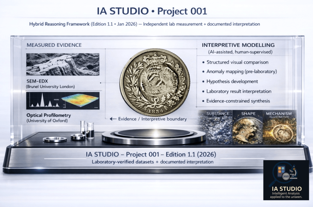 Developed through IA STUDIO’s first documented case study (Project 001: The 1834 William IV Sixpence), the framework defines how analytical reasoning, digital modelling, and independent scientific validation operate together within a reproducible research process.