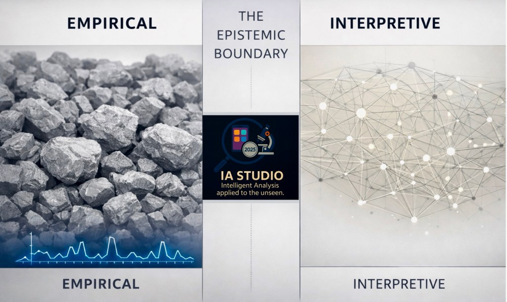 By separating empirical evidence from interpretive modelling, IA STUDIO ensures that every conclusion remains traceable, reproducible, and explicitly grounded in independently verified data.